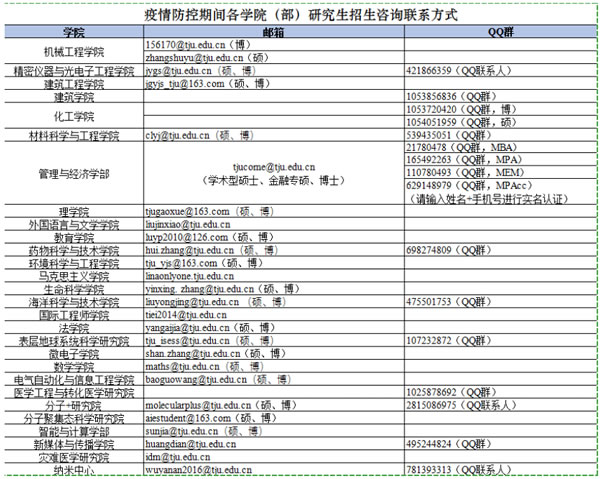 疫情防控期间各学院(部)联系方式详见下文(如有变化以各学院网站或通知为准)。如有硕士以及博士研究生招生学院层面的咨询可与相应报考学院联系。同时请及时关注天津大学研究生招生信息网(yzb.tju.edu.cn)以及“天津大学”、“天津大学研究生教育”和“天津大学研究生招生”微信公众号相关通知。